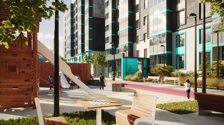 Инфраструктура: В комплексе будет продуктовый магазин и три коммерческих помещения на первом этаже. Открытая автостоянка на 153 места и контейнерная площадка для мусора. Во дворе — детские игровые городки, спортивные площадки и лавочки для отдыха. Территория закрыта и оборудована видеонаблюдением.