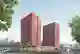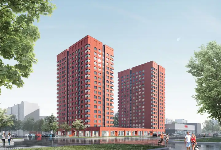 Комплекс комфорт-класса включает две 18-этажные башни с эксплуатируемой крышей, соединенные стилобатом. На стилобате будет спортивная площадка, продолжающая двор. Здание выполнено в терракотовом цвете, объединяющем башни и стилобат в единую композицию. Локация станет современным городским кварталом для активных и семейных жителей.